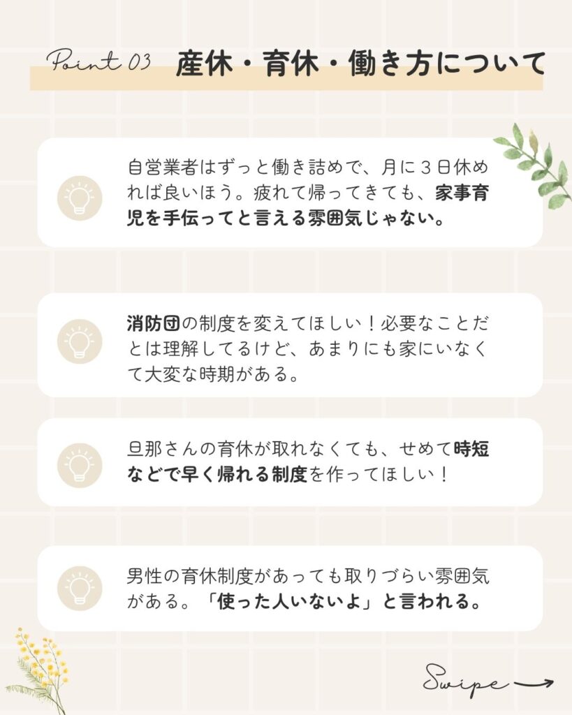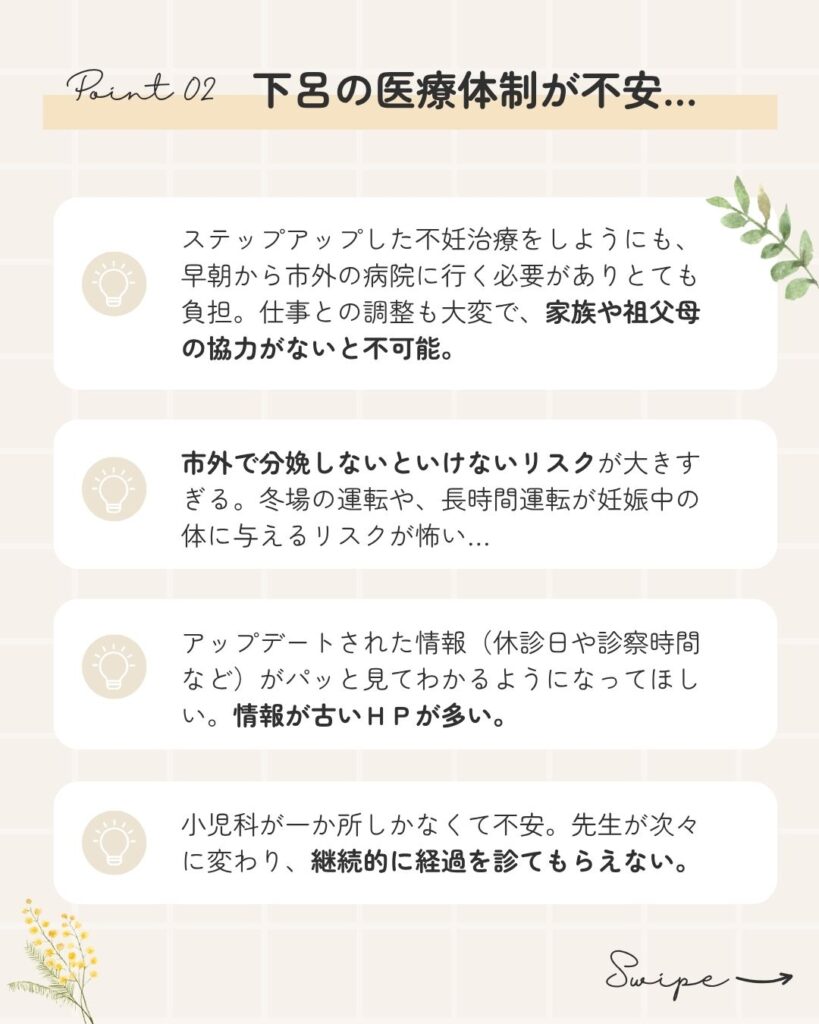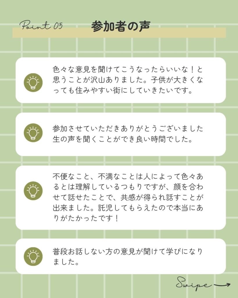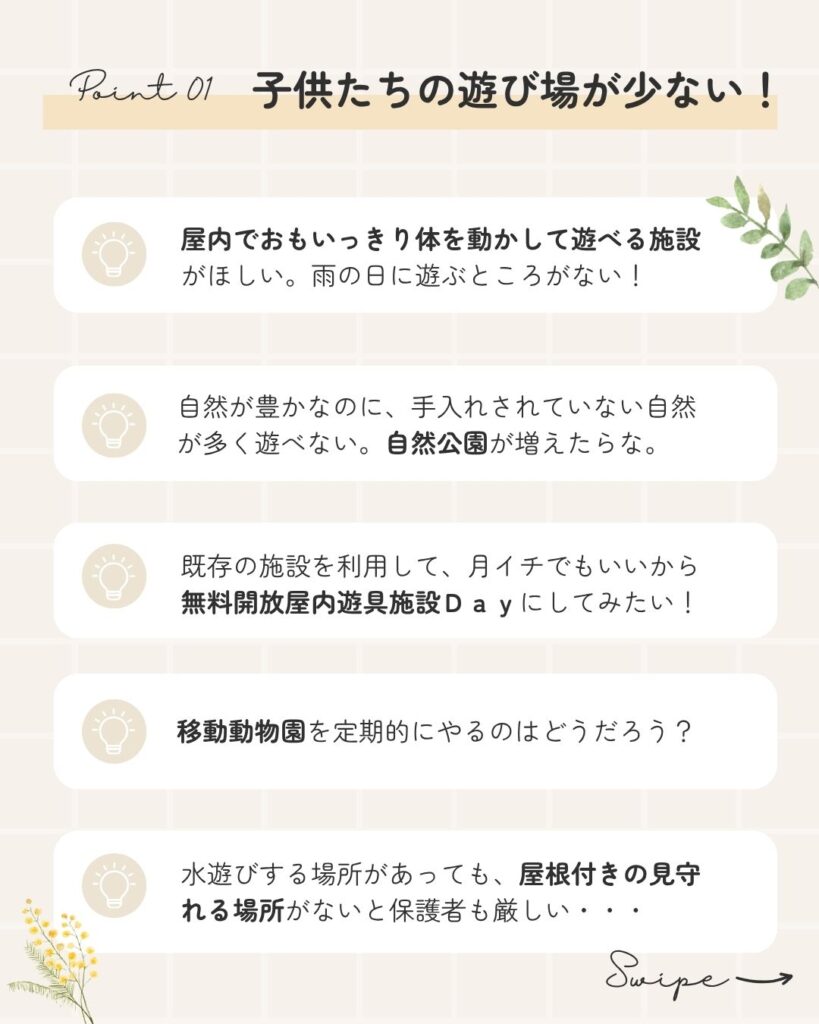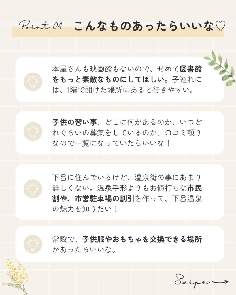 みらいプロジェクト 開催報告&次回開催予定2025年10月23日2025年10月23日お知らせ 下呂市在住の子育て世代の方にお集まりいただき、地域に「あったらいいな」を語り合う、子育て世代の交流会『第1回 みらいプロジェクト&子育て座談会』を2025年10月21日に開催いたしました。 参加してくださった皆様のご意見をまとめました。 いただいた貴重なご意見は、今後、行政や企業とも連携し、少しでも実現に向けて取り組んでまいります。 第2回11月18日(火)は、大好評につき、満席のご予約をいただいております。 そこで、この活動を知り、少しでも興味を持った方、参加してみたい方に向け、第3回の開催を決定しました。 第3回は、12月16日(火)10時開催予定です。 下呂市をもっと「住み続けたい」子供たちが「帰ってきたい」と思える魅力的な街にするために、引き続きのご協力をどうぞよろしくお願いいたします。 【日 時】12月16日(火)10:00~【参加費】無料 咖喱奔放のカレー・フリードリンク付き【定 員】12名【お申込】申込みフォームよりお申込みください。【お問い合わせ先】お問合せフォームから、または0576-20-4241まで、お気軽にどうぞ 前今週のご案内 2025.10.21