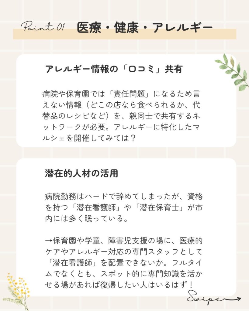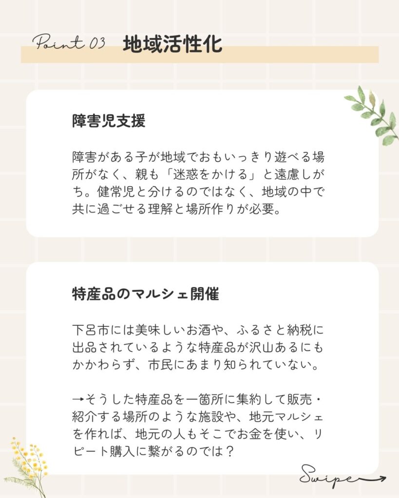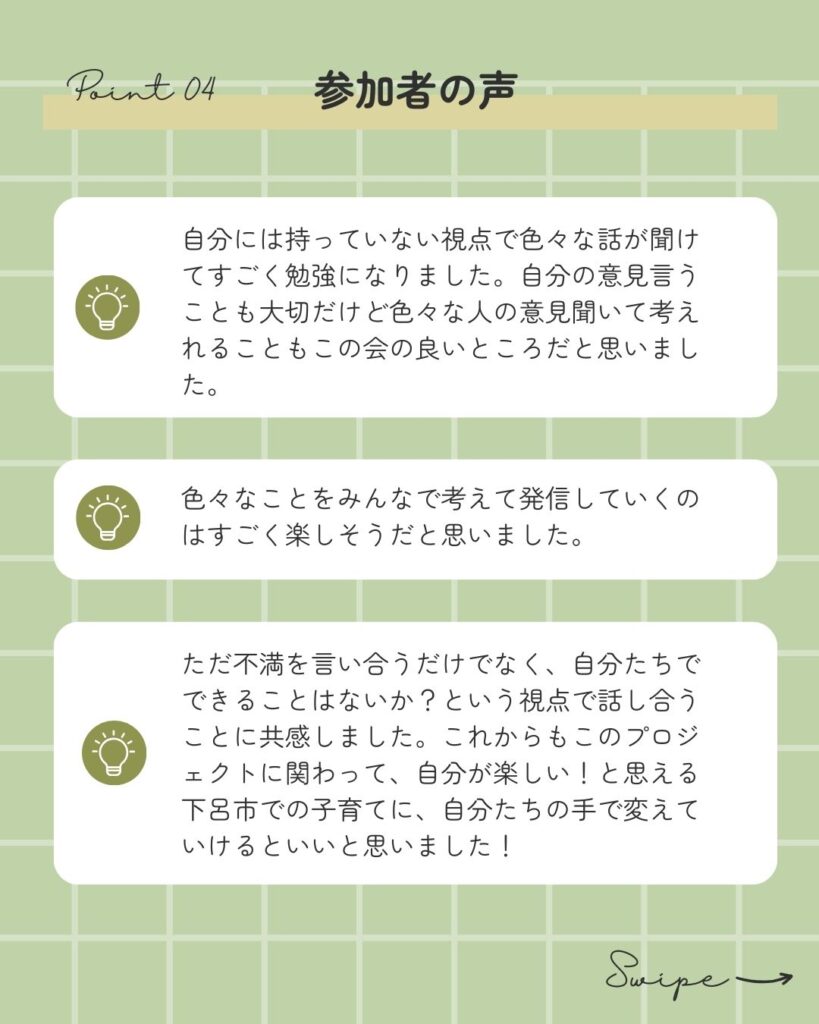 みらいプロジェクト活動報告 ~私たち市民にできること~2026年2月25日2026年2月25日お知らせ, 活動報告 みなさん こんにちは2月19日に子育て世代のみなさんと一緒に「みらいプロジェクト」を開催しました。毎回のことなのですが、今回も2時間では全く足りないほどの大盛り上がり。「わかる!」「私もそう思っていた!」といった共感や、「そんな視点があるとは思わなかった!」といった新たな発見も。「ただ不満を言うだけじゃなくて、自分たちでよくしていこう!と前向きに行動してく姿勢に共感した」とうれしいお声をいただきました。今回のメインテーマは、10月11月12月の3回に渡って行われた座談会で出た意見をもとに、「じゃあ、私たち『市民』には何ができる?」というアイデアを出し合う作戦会議でした。 日々の困りごとの共有から始まったこのプロジェクトですが、現在は、「どうすればこの街がよりよくなるか」を考え、行動していくフェーズに入っています。次回は、3月17日㈫開催予定です。これからも「ここで子育てしたい」と思える下呂市を共に作っていきましょう。ご興味のある方は、ぜひお気軽にお問い合わせください。 前今週のご案内 2026.2.24
